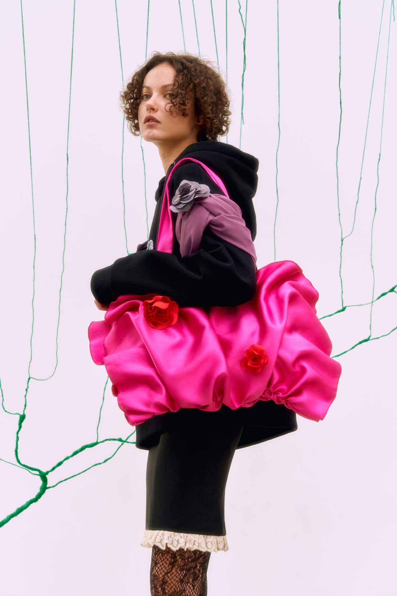 Худи из футера с начесом превращается в элемент театрализованной игры. Драпировки на плечах напоминают одновременно сценические декорации и платья героинь-принцесс. Съемные розы и связанные вручную цветы блестят серебром и переносят в тайное, пахнущее букетами и интригами закулисье.