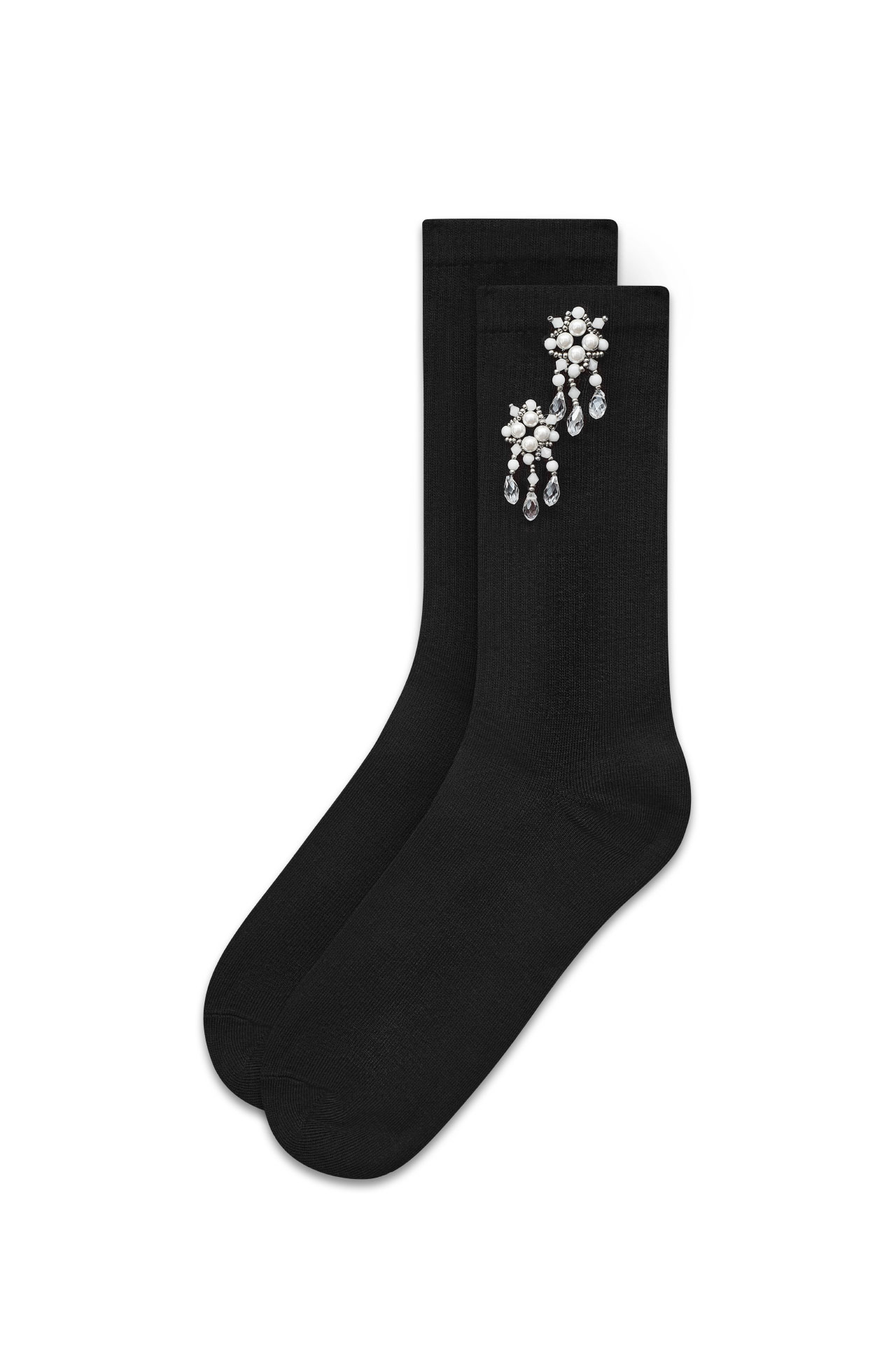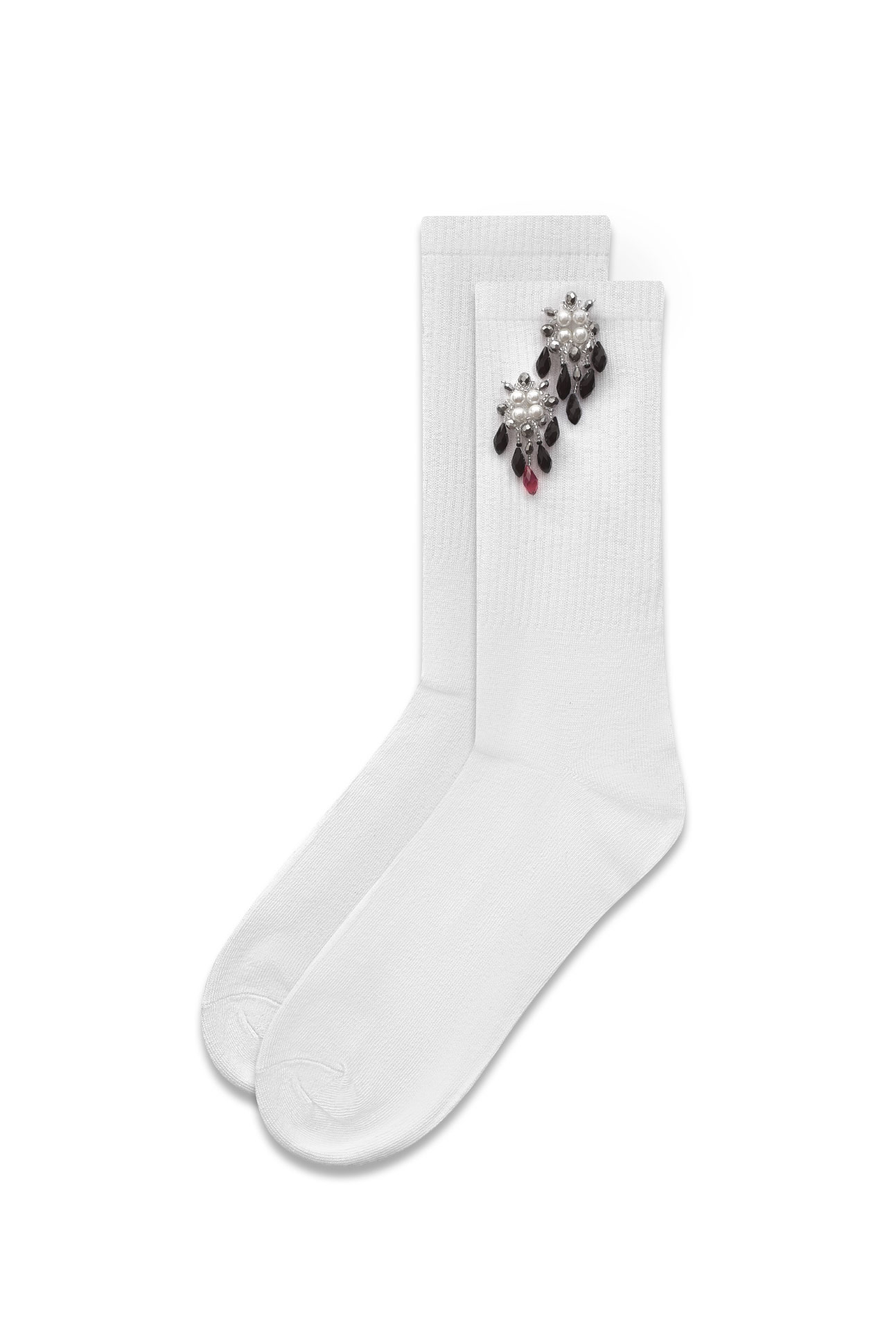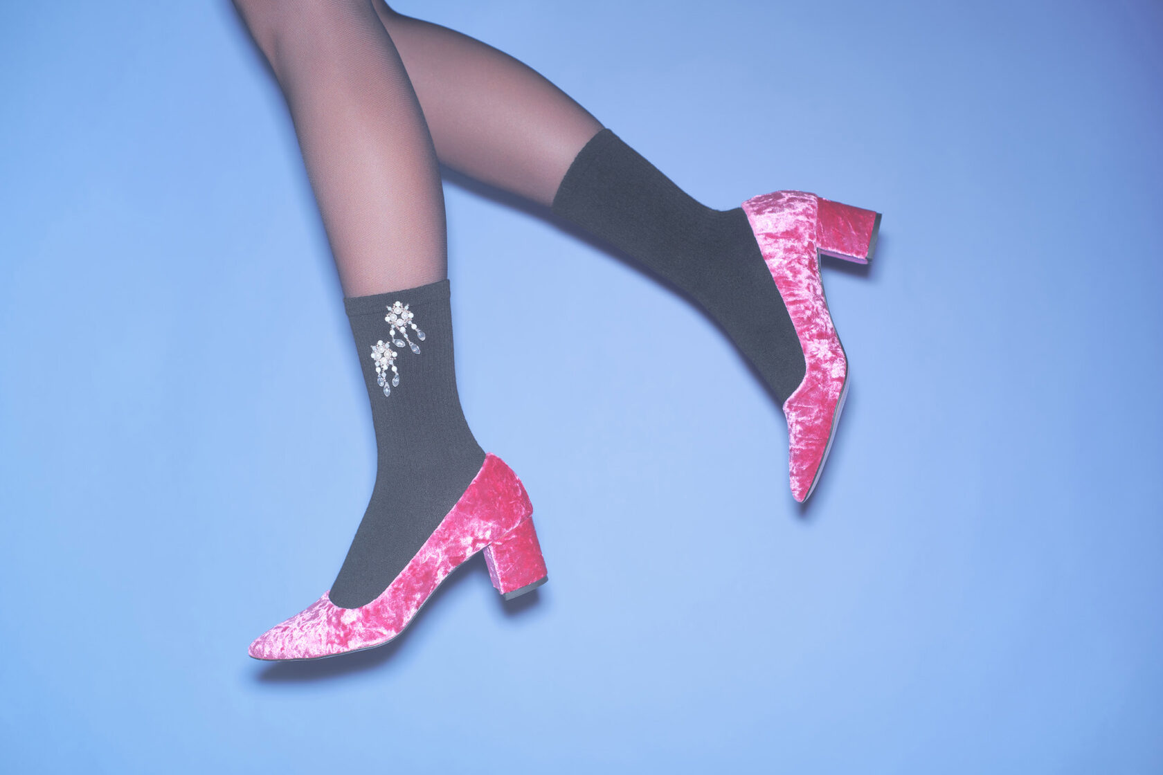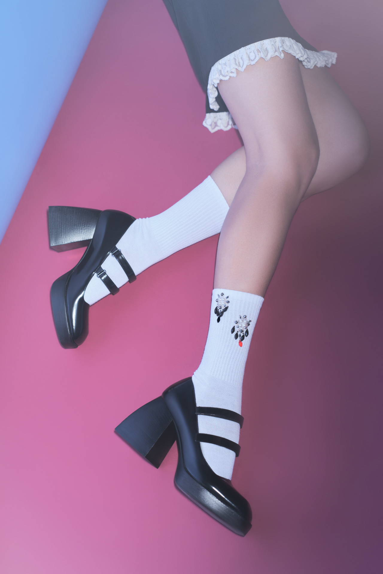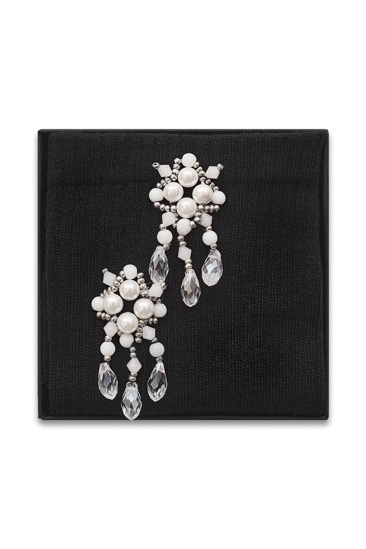 Если и плакать, то только драгоценными камнями, — как бы говорит эта стейтмент-пара. А еще дразнит всех, кто считает носки банальным подарком: эти — порадуют не меньше новых сережек. Декор — кропотливая ручная работа, покрытие из натурального жемчуга, бусины и подвески из граненого стекла. Блестят заметно, но тактично. Приедут в нарядной коробке, перевязанной бархатной лентой с кристаллом.