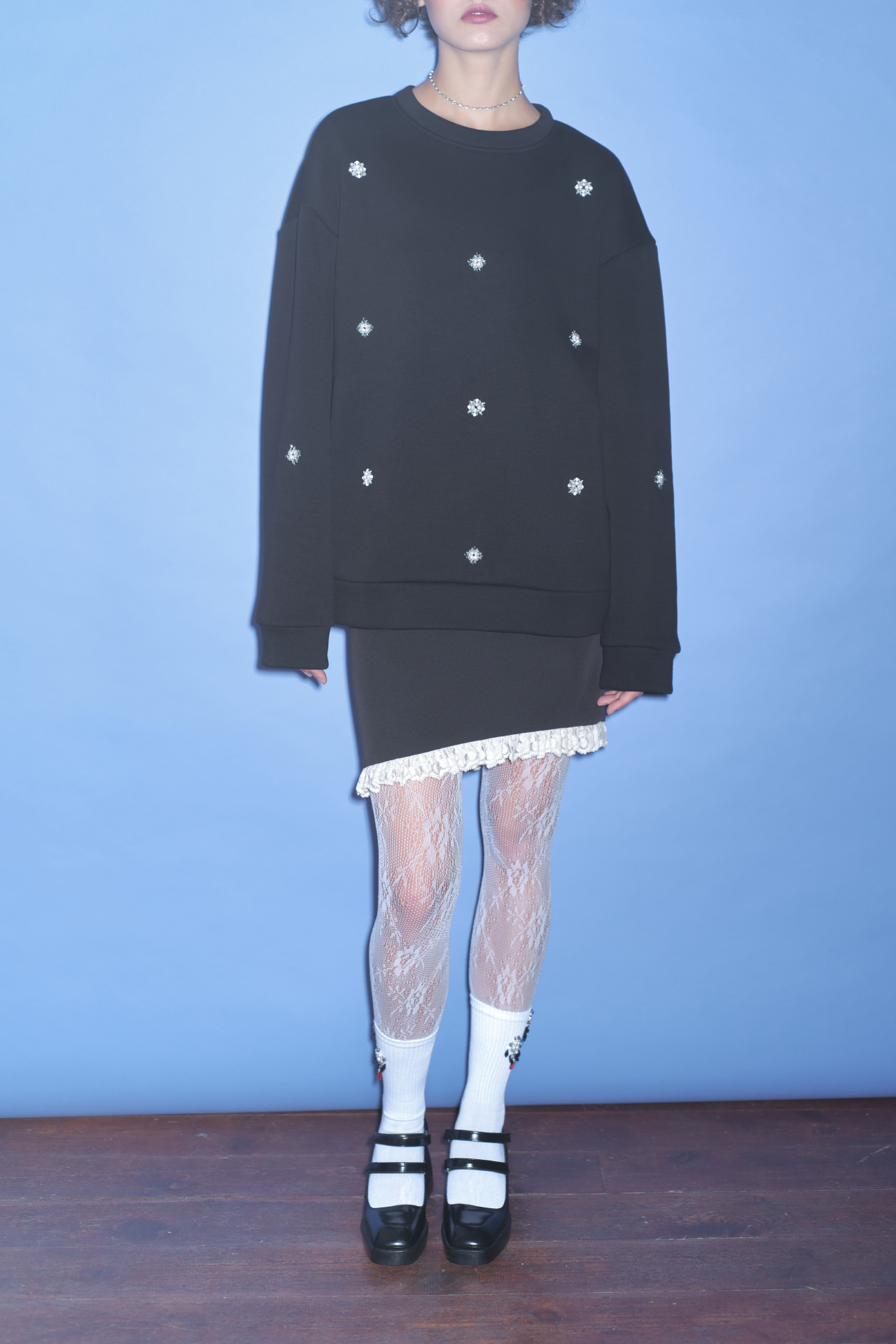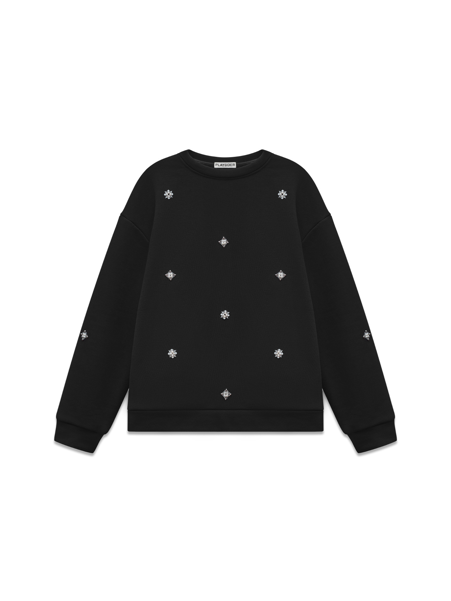 Этот свитшот из мягкого футера, подбитый начесом, готов не просто согревать, но служить напоминанием: каждый день — праздник. Даже если на поверку все не так, он способен это исправить. Как подспорье — натуральный жемчуг и белый агат, вручную соединенные в волшебные звезды. Говорят, они работают не хуже оберега, особенно если преподносятся в подарок.