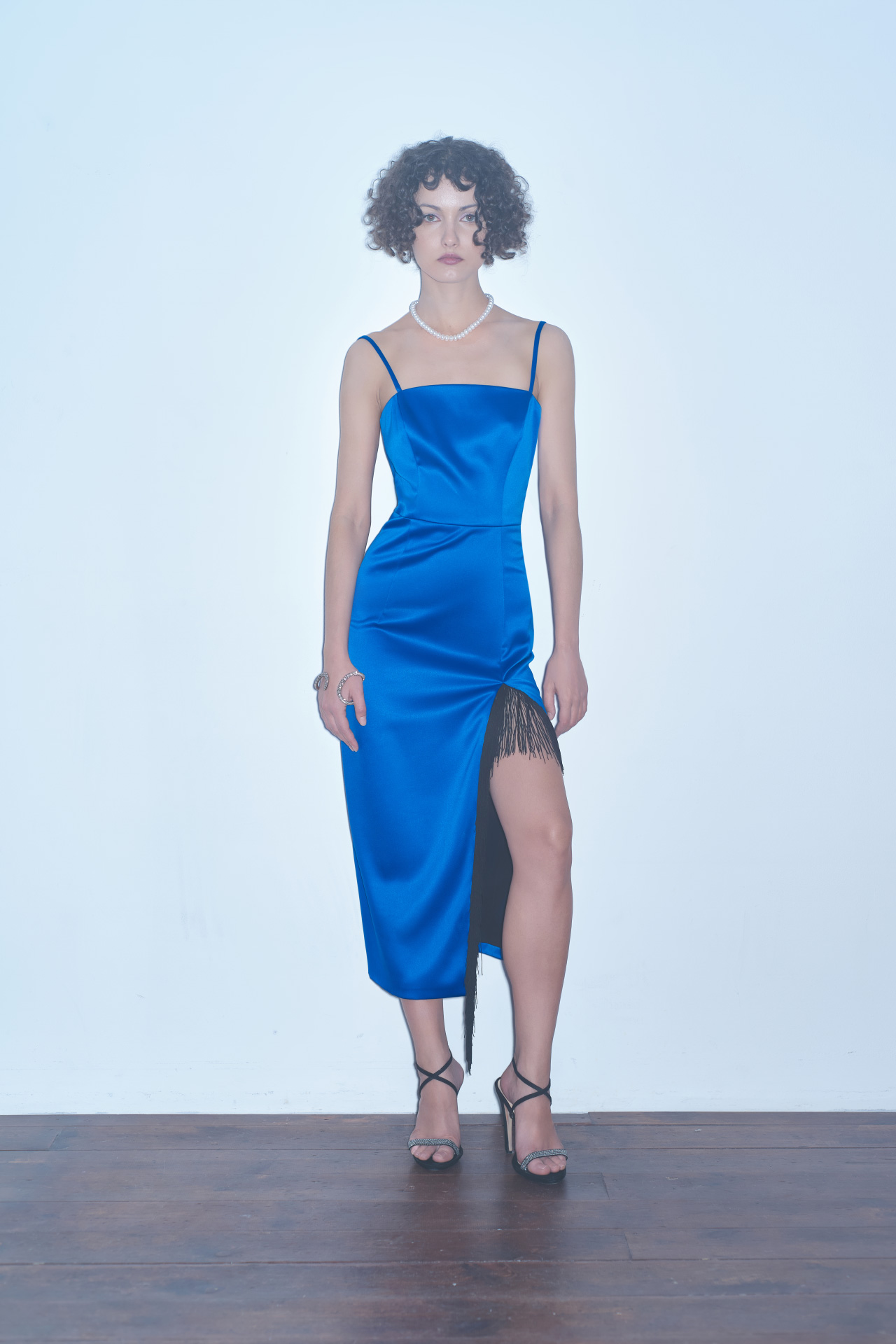 Платье — воплощение той самой ночи, когда натанцевавшись вдоволь, выходишь подышать и оказываешься под лунным гипнозом. Небесно-голубой атлас, смелый разрез и игривая бахрома (которая вас еще перетанцует) перенесут в бурные 1920-е, приукрасят 2020-е и подарят несчетные, как звезды, комплименты.